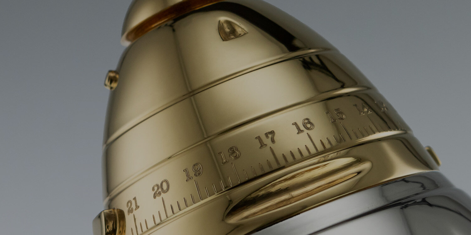 Ingeniously designed in three sections, the base contains a pull-out framework with either four compartments for shot glasses or chips and double card deck holder on top, the shell's top serves as the shaker, the lid contains a removable interior strainer and a cap. The shell is partially gold plated in yellow and rose gold to imitate the original brass and copper finish. The shaker comes in a fitted presentation case.